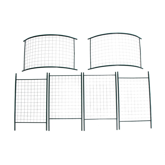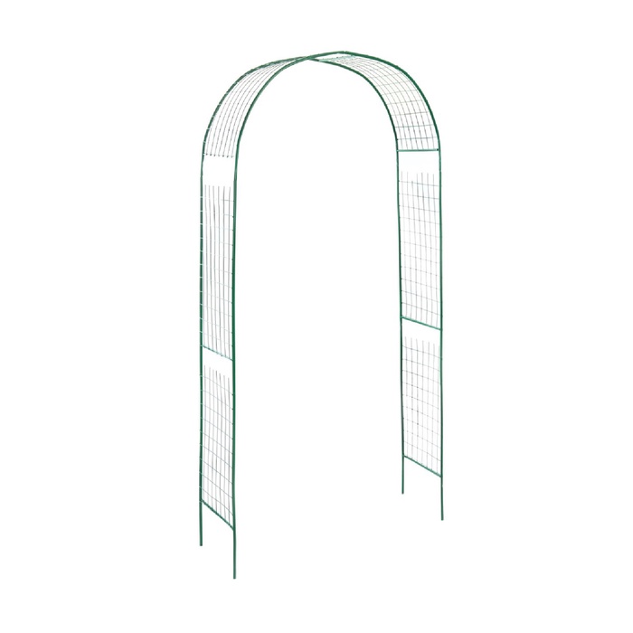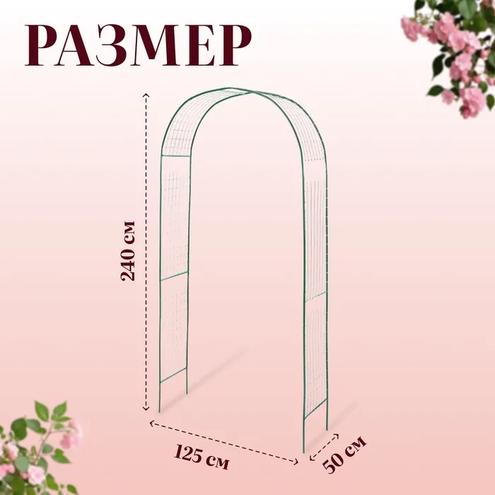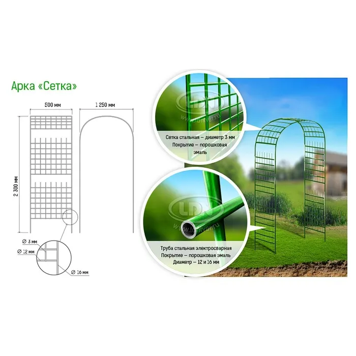 Лёгкая конструкция из металла выдерживает вес растений, устойчива к воздействию осадков и температуры. Под аркой не нужен фундамент, вы можете разбирать её и переносить по участку. От коррозии изделие защищает краска зелёного цвета, которая гармонирует с листьями.