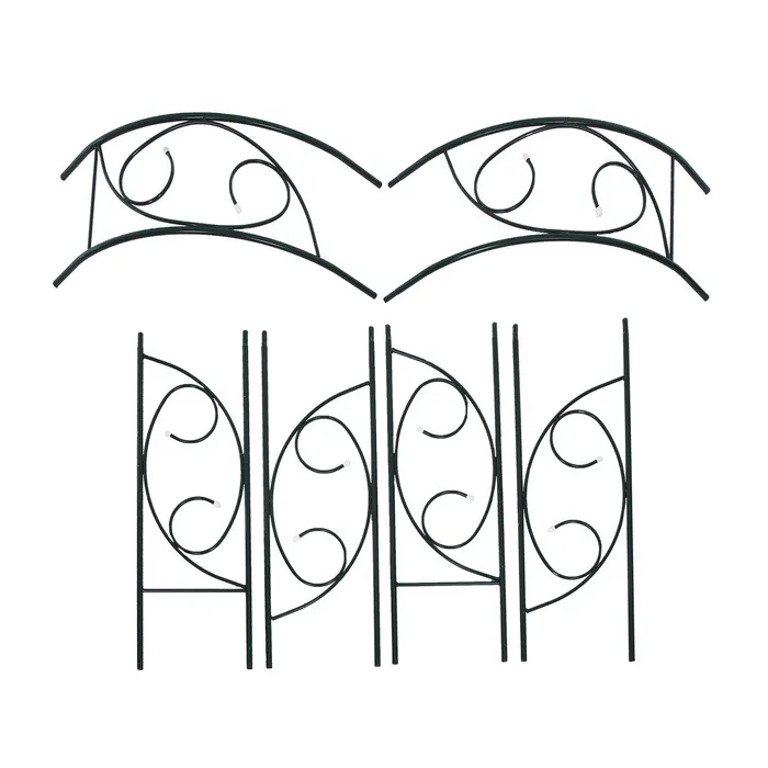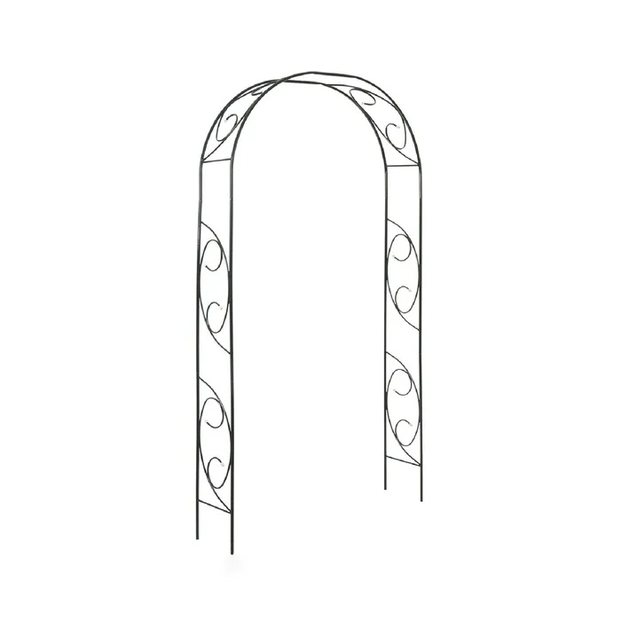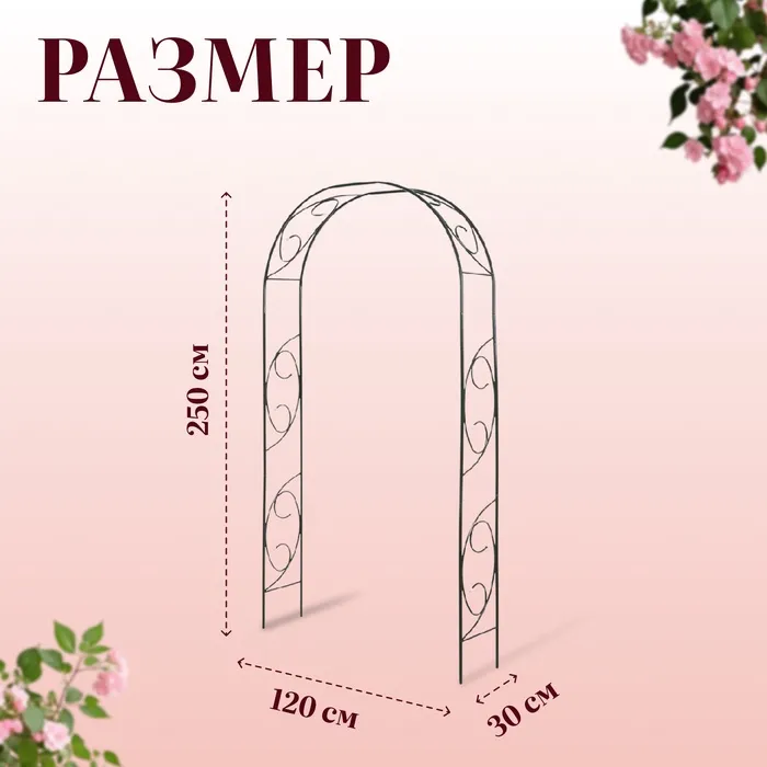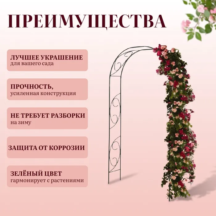 Лёгкая конструкция из металла выдерживает вес растений, устойчива к воздействию осадков и температуры. Под аркой не нужен фундамент, вы можете разбирать её и переносить по участку. От коррозии изделие защищает краска зелёного цвета, которая гармонирует с листьями.