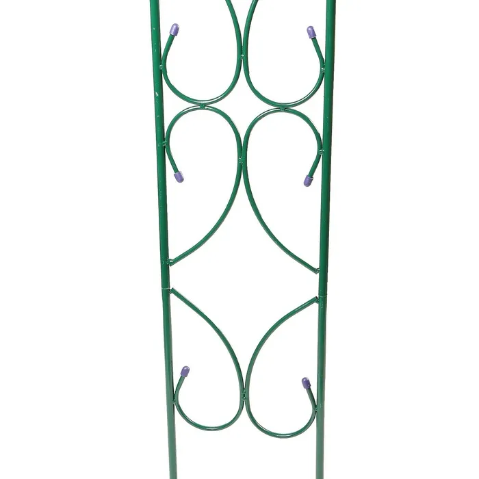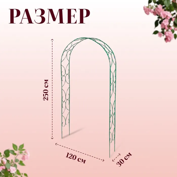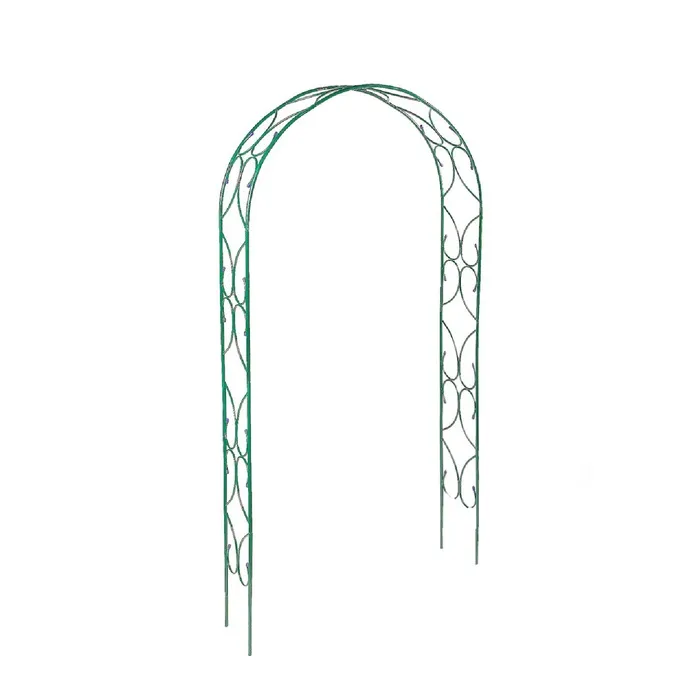 Лёгкая конструкция из металла выдерживает вес растений, устойчива к воздействию осадков и температуры. Под аркой не нужен фундамент, вы можете разбирать её и переносить по участку. От коррозии изделие защищает краска зелёного цвета, которая гармонирует с листьями.