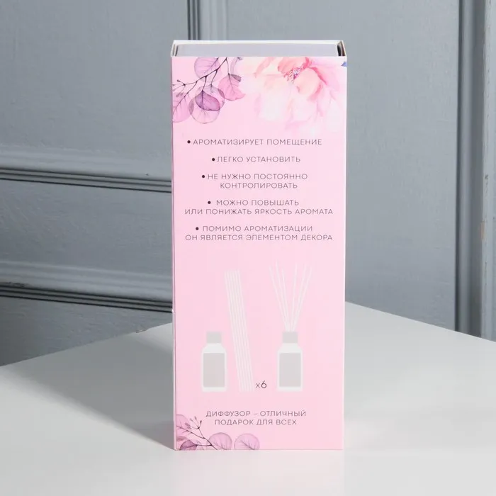извлеките диффузор из упаковки, откройте крышку и защитный колпачок, опустите фибровые палочки в ароматизированную жидкость и наслаждайтесь. Ароматизированная жидкость пропитывает фибровые палочки, и, с их помощью аромат распространяется по всему помещению.