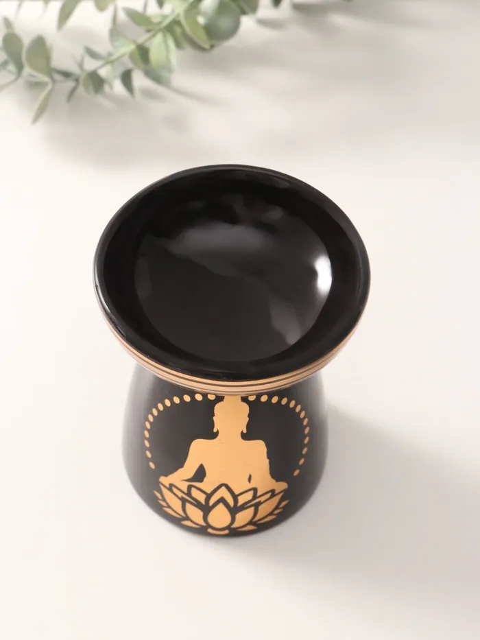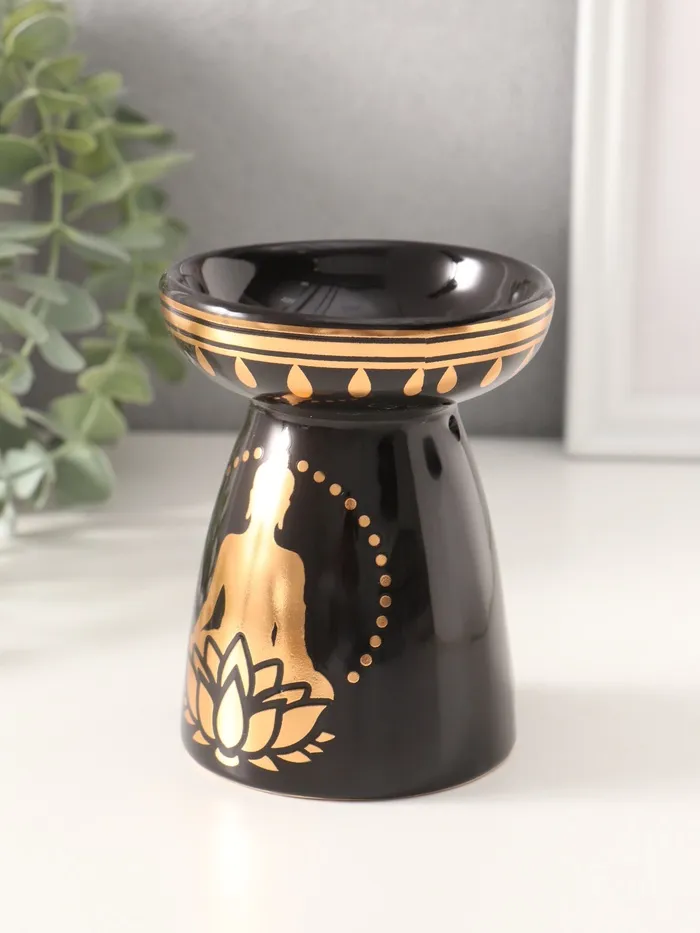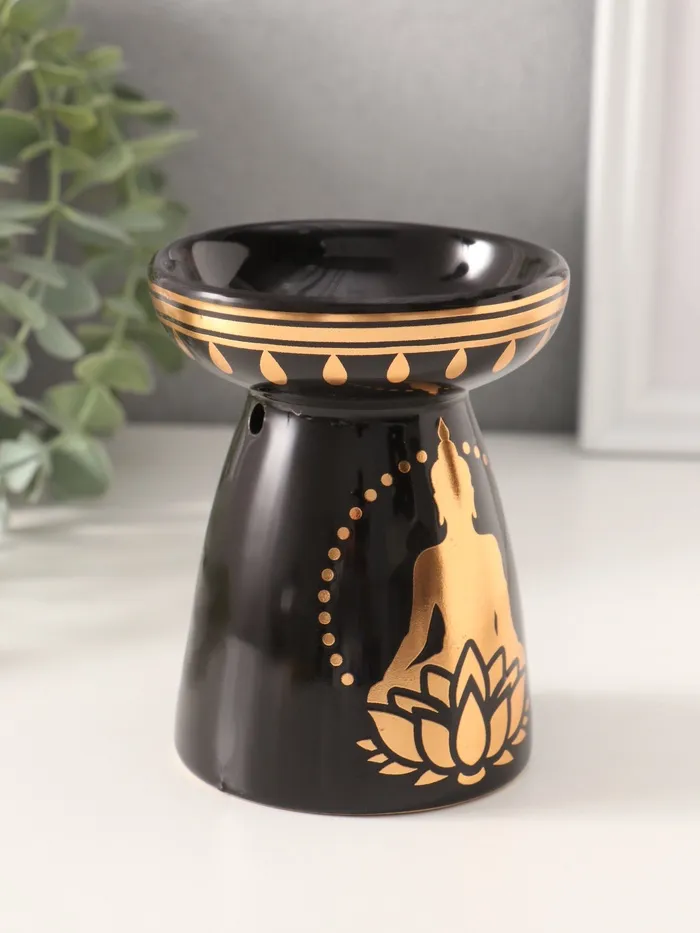 Аромалампа для эфирных масел «Будда и лотос», керамика, чёрная с золотом, 9.3×9.3×11.8 см