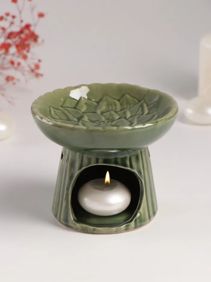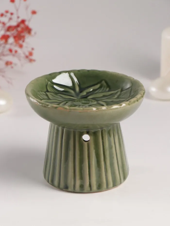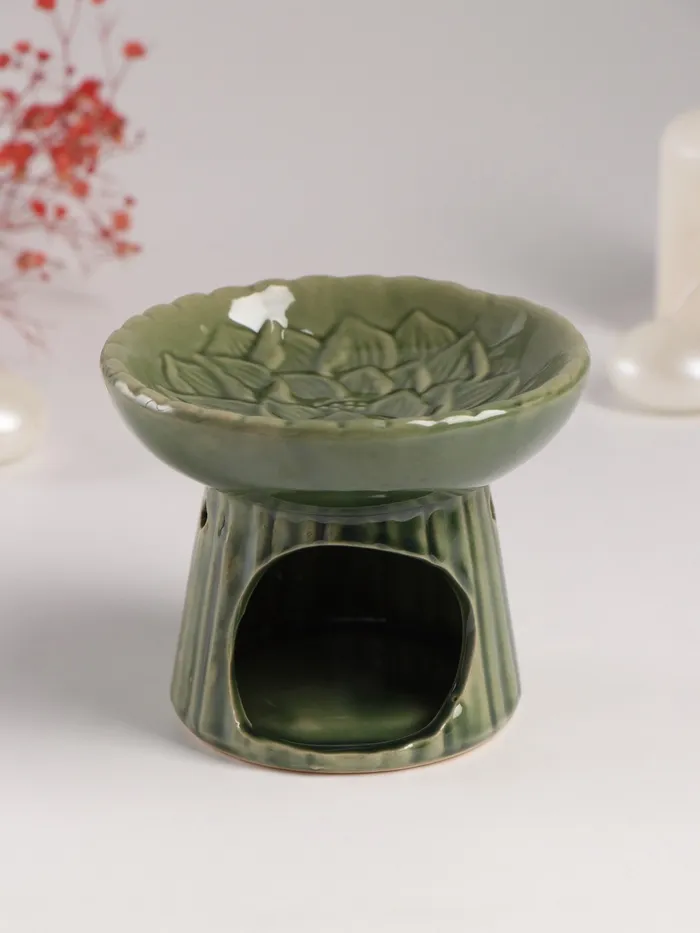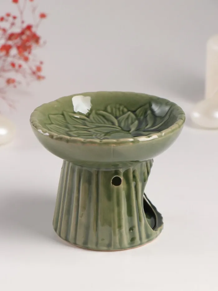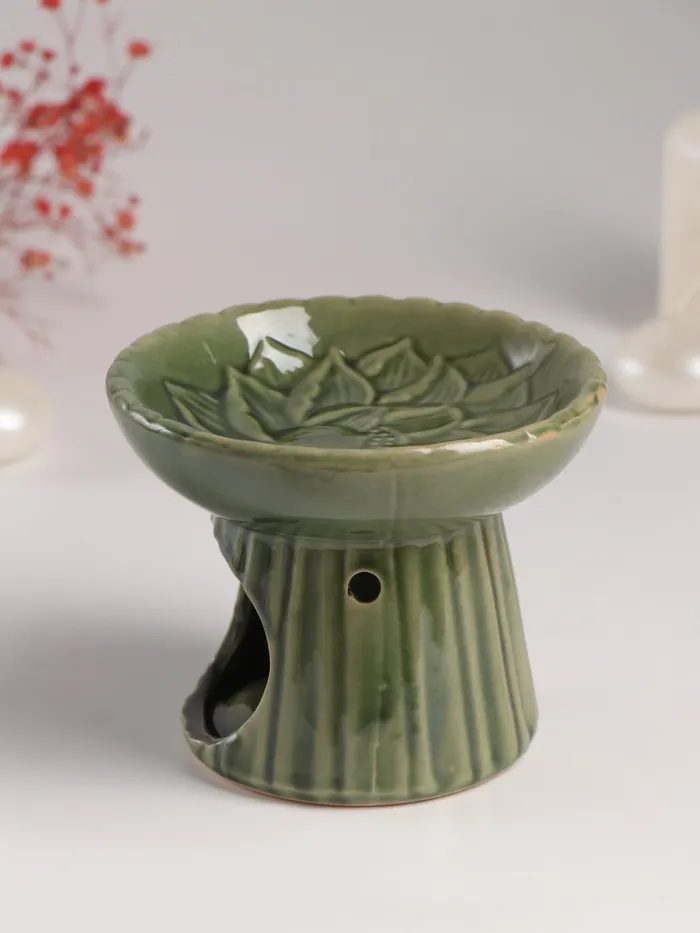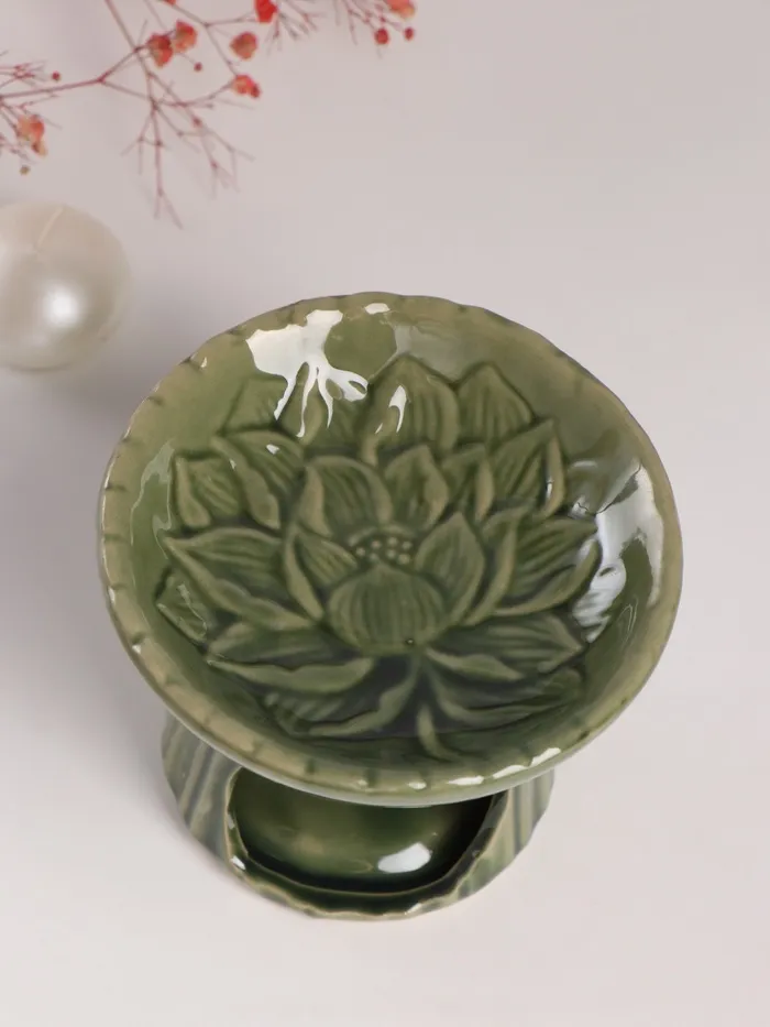 Откройте для себя гармонию и спокойствие с элегантной аромалампой, вдохновленной природой. Эта керамическая лампа в нежном темно-зеленом цвете, выполненная в форме лотоса, станет не только источником приятного аромата, но и стильным акцентом в вашем интерьере. Высота 9 см и размеры 11.4×11.4 см делают её идеальной для любого пространства — будь то уютный уголок в гостиной или расслабляющая атмосфера в ванной.