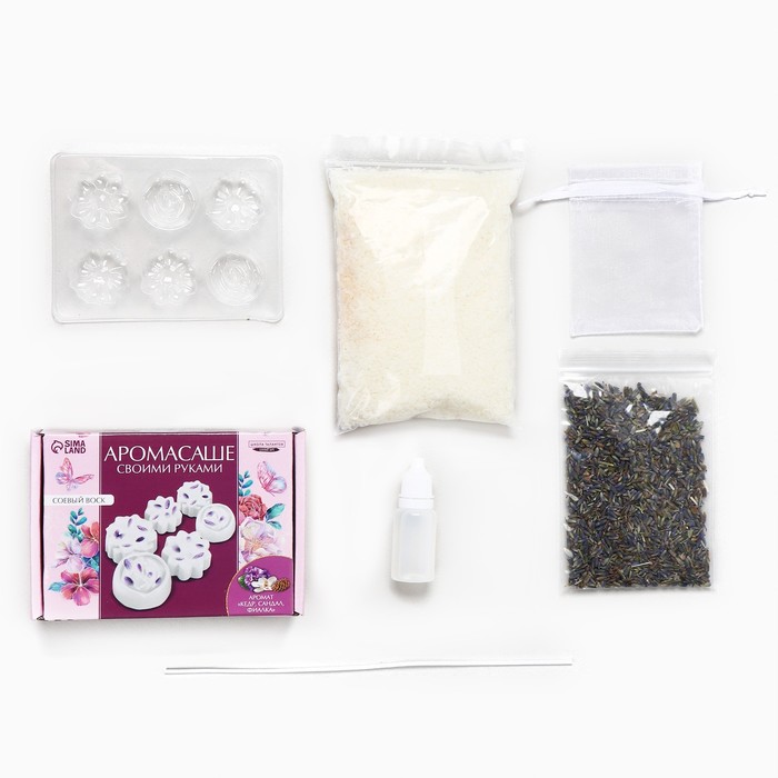 Соевый воскПластиковая формаАроматизатор «Кедр Сандал Фиалка»Мешочек из органзыСухоцветыХлопковый фитиль 20 смКак сделать аромасаше: