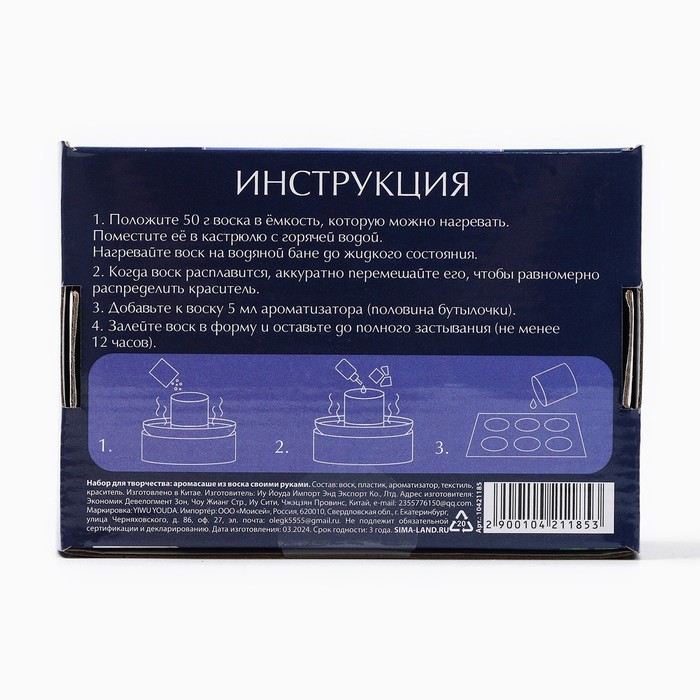 Положите 50 г воска в ёмкость, которую можно нагревать.Поместить её в кастрюлю с горячей водой.Нагревайте воск на водяной бане до жидкого состояния.Когда воск расплавится, аккуратно перемешайте его, чтобы равномерно распределить краситель.Добавьте к воску 5 мл ароматизатора (половина бутылька).Аккуратно залейте воск форму и оставьте до полного застывания не менее 12 часов.Восковое саше - это вечный аромакамень, который будет радовать Вас на протяжении полутора-двух месяцев, а после Вы можете нанести немного парфюма или несколько капель масла на любую сторону, и аромасаше будет продолжать радовать Вас ароматом.