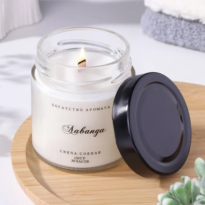 Ароматическая свеча в банке, 150 г, из соевого воска, деревянный фитиль, лаванда