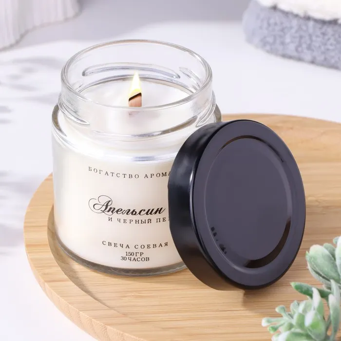 Ароматическая свеча в банке, 150 г, из соевого воска, деревянный фитиль, апельсин и чёрный перец