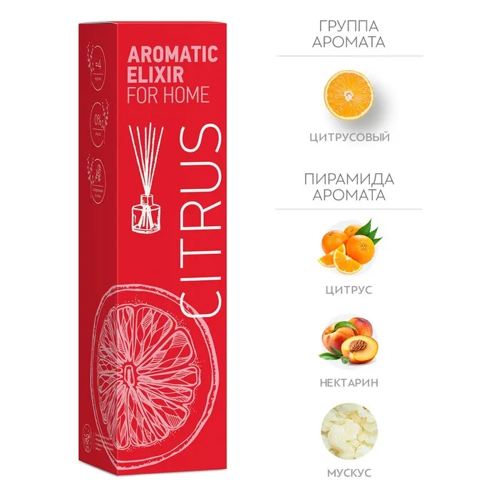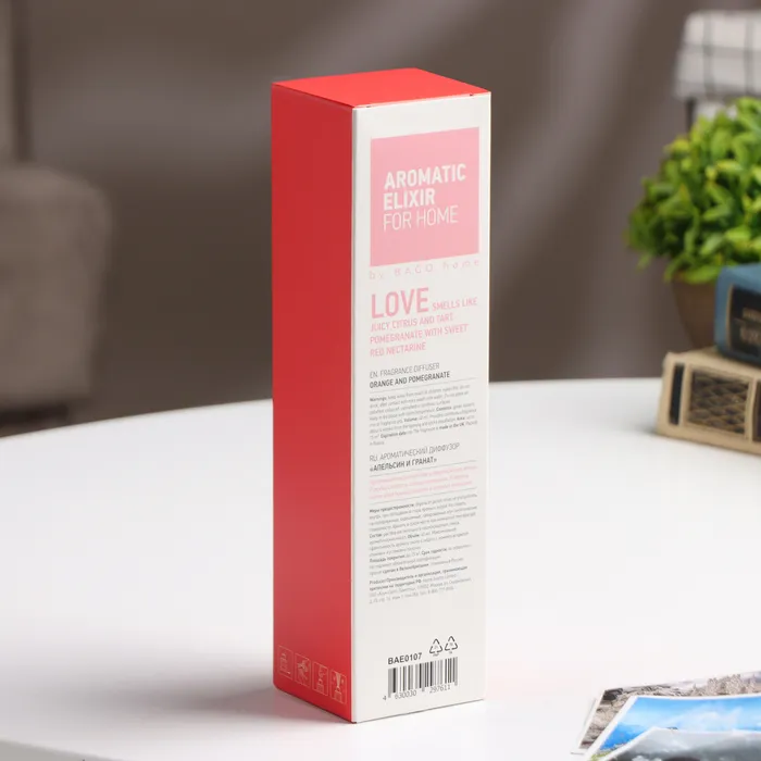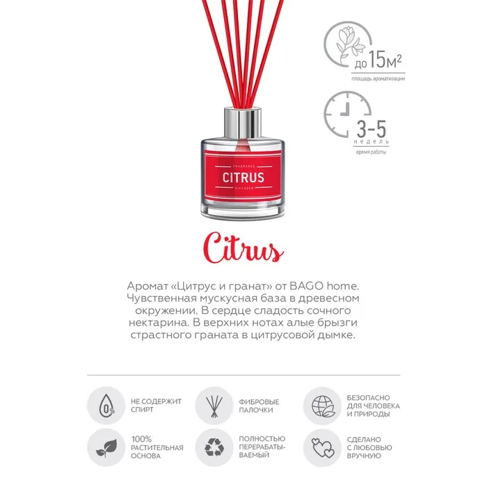Ароматический диффузор "Апельсин и гранат" от BAGO home пульсирует сочной энергией. Ароматический диффузор в насыщенном алом цвете 25 мл. Время работы: 4 недели. Площадь ароматизации: 15 м2. В комплекте 6 красных фибровых палочек из прессованного волокна.