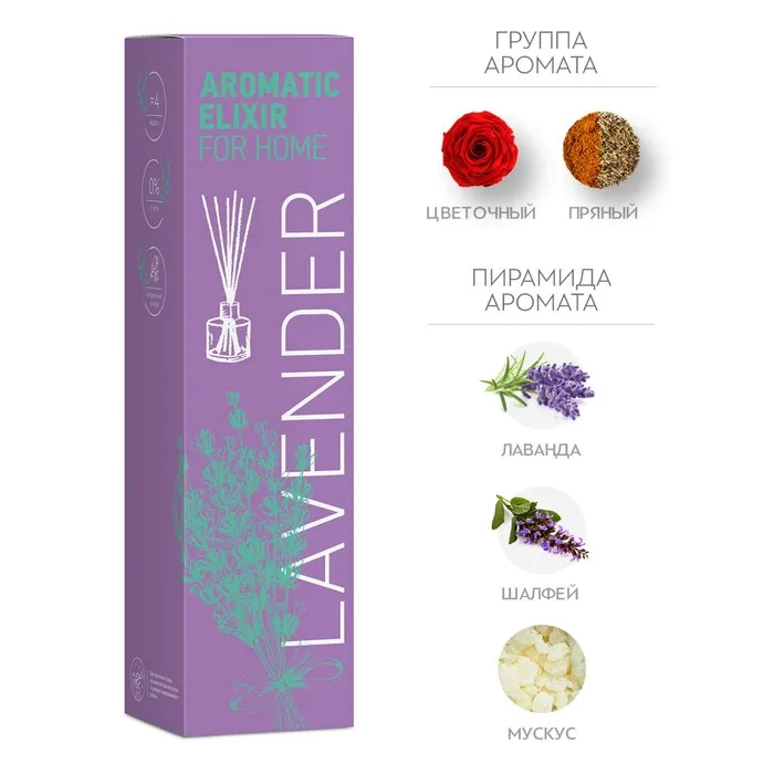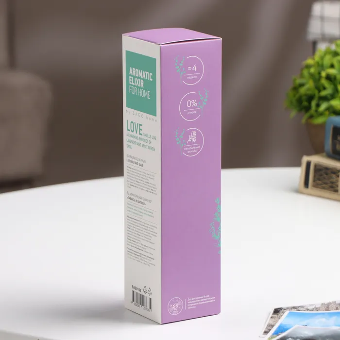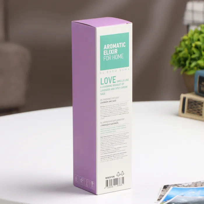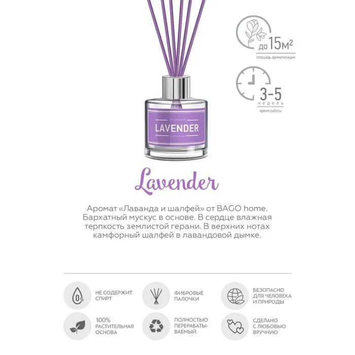 Ароматический диффузор "Лаванда и шалфей" от BAGO home, объемом 25 мл, превращает любое пространство в бесконечное поле цветов. С его помощью вы можете наслаждаться ароматом до 4 недель, охватывая площадь в 15 м². Комплект включает 6 лиловых фибровых палочек, позволяющих регулировать интенсивность аромата.