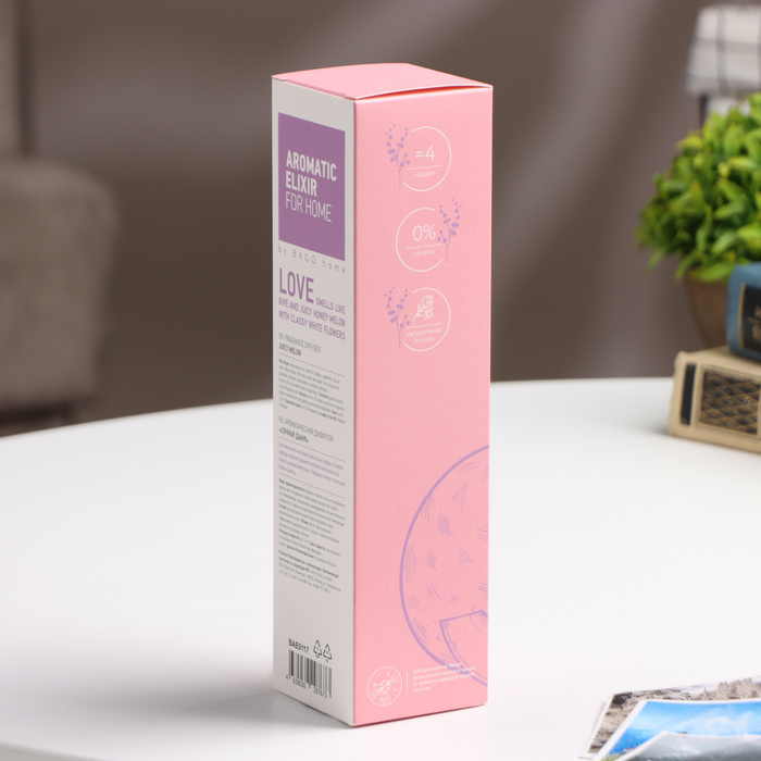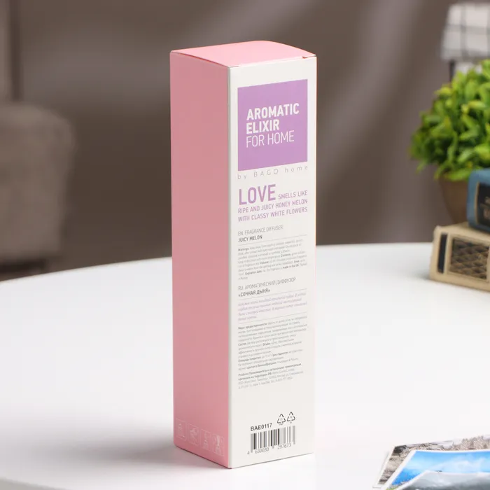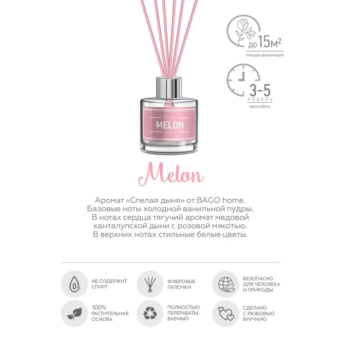 Ароматический диффузор "Сочная дыня" от BAGO home приглашает насладиться сочной мякотью спелой дыни. Изысканный дизайн в нежном розовом цвете с объемом 40 мл гарантирует до 4 недель утонченного ароматизирования пространства площадью до 15 м². Комплект из 6 розовых фибровых палочек позволяет настроить интенсивность аромата по вашему желанию.
