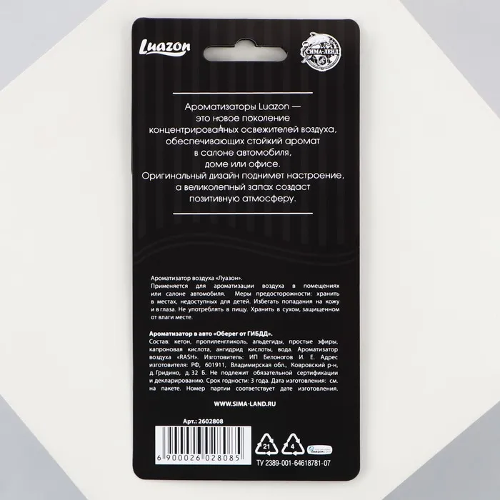 Это оригинальный и полезный подарок для всех любителей езды с ветерком! Он сделает более комфортными ежедневные путешествия по трассам и пробкам. Стильный дизайн и приятный запах не оставят равнодушными ни владельца машины, ни пассажиров.