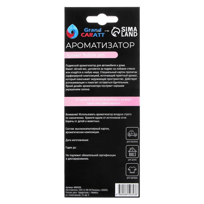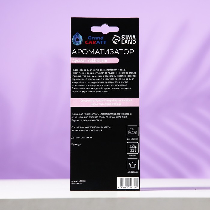 Подвесной ароматизатор для автомобиля и дома. Имеет лёгкий вес и цепляется за подвес на лобовое стекло или кладётся в любую нишу. Специальный картон пропитан парфюмерной композицией и источает приятный аромат, который охватит окружающее пространство и будет успокаивать и одновременно помогать оставаться бдительным. А яркий дизайн ароматизатора послужит хорошим украшением для салона.