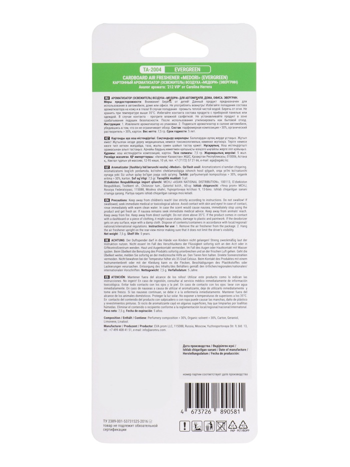 Ароматизатор картонный Evergreen, фруктово-цветочный, с нотой розы — Характеристики