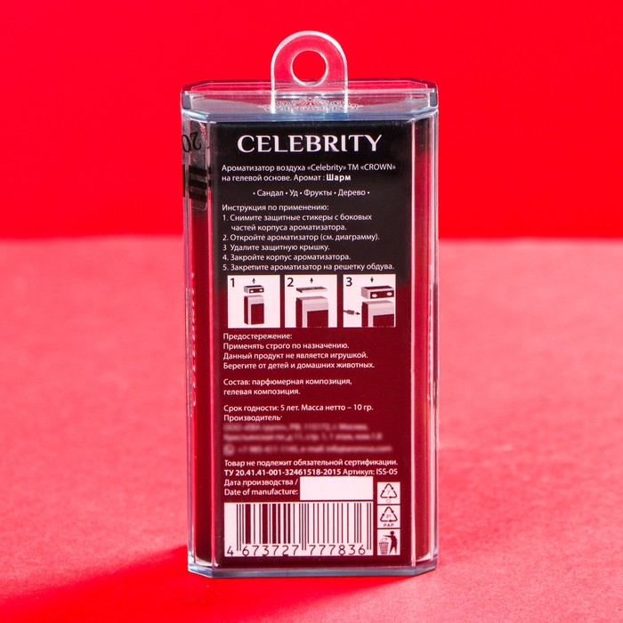 Ароматизатор на гелевой основе CROWN CELEBRITY CHARM раскрывается ярким взрывом мадагаскарского перца в сочетании с легким звучанием нот красной смородины, распускаясь удивительными древесными нотами пачули и мускуса и изысканным цветочным букетом из роз, жасмина и пионов. Для создания данной ароматической композиции используются только высококачественные парфюмерные отдушки из Франции.
