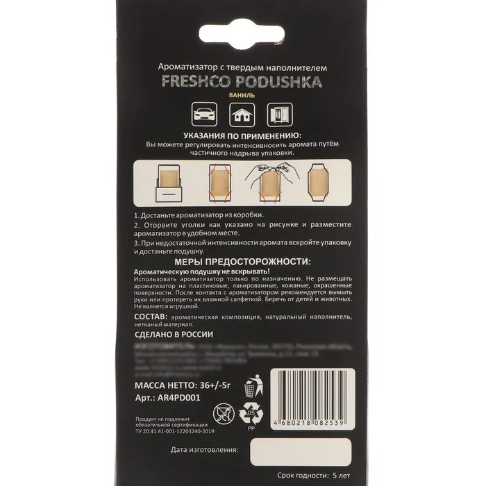 “Vkusno Podushka” изготовлена из качественных и безопасных материалов, которые не вызывают аллергических реакций. Благодаря компактным размерам ароматизатор легко помещается под сиденьем, не мешая при этом водителю и пассажирам.