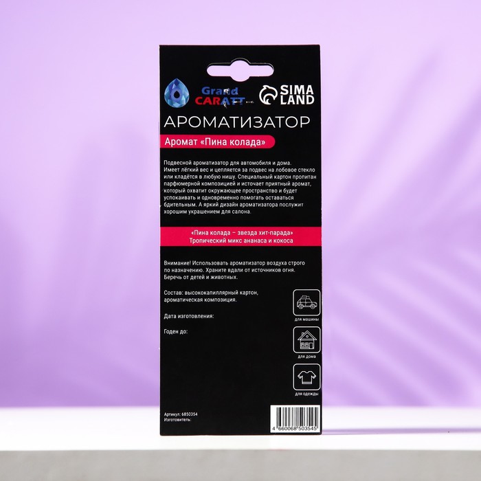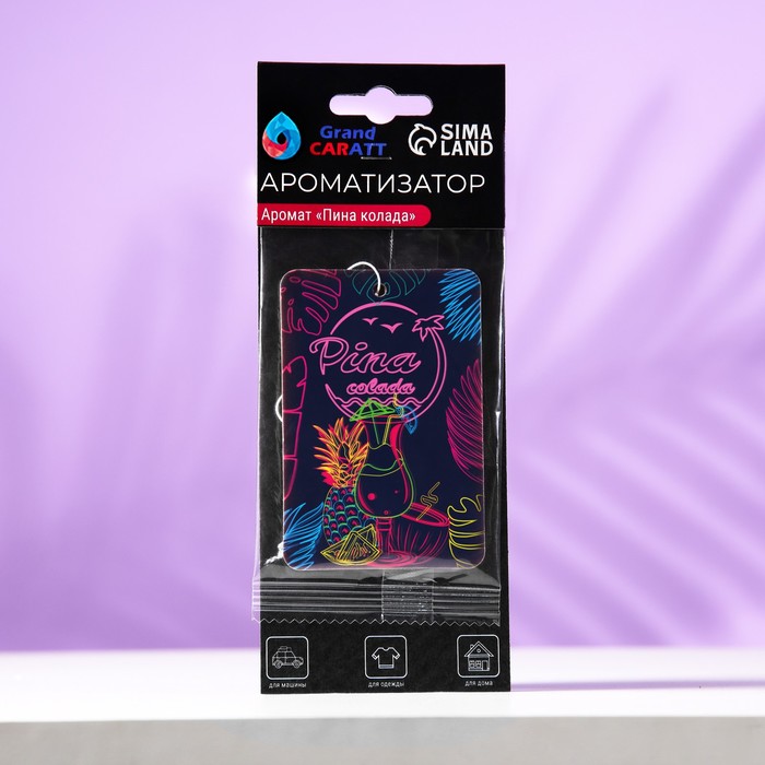 Подвесной ароматизатор для автомобиля и дома. Имеет лёгкий вес и цепляется за подвес на лобовое стекло или кладётся в любую нишу. Специальный картон пропитан парфюмерной композицией и источает приятный аромат, который охватит окружающее пространство и будет успокаивать и одновременно помогать оставаться бдительным. А яркий дизайн ароматизатора послужит хорошим украшением для салона.