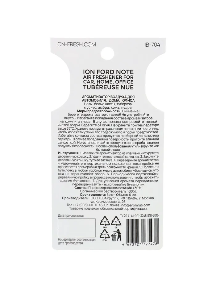 Ароматизатор подвесной ION, 6 мл — Характеристики