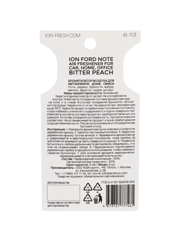 Ароматизатор подвесной ION, PEACH, 6 мл — Характеристики
