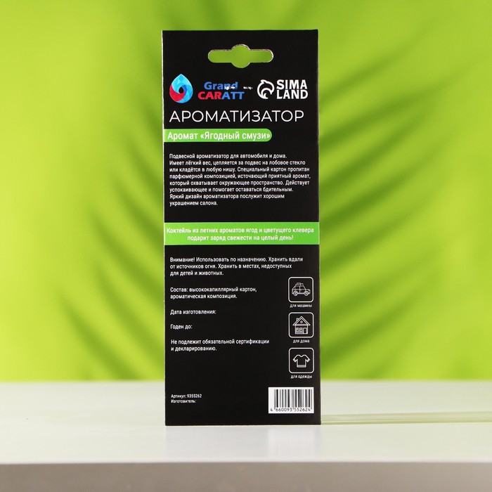 Подвесной ароматизатор для автомобиля и дома. Имеет лёгкий вес, цепляется за подвес на лобовое стекло или кладётся в любую нишу. Специальный картон пропитан парфюмерной композицией, источающий приятный аромат, который охватывает окружающее пространство. Действует успокаивающее и помогает оставаться бдительным. Яркий дизайн ароматизатора послужит хорошим украшением салона.