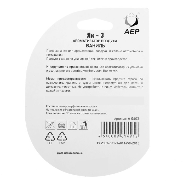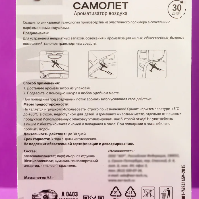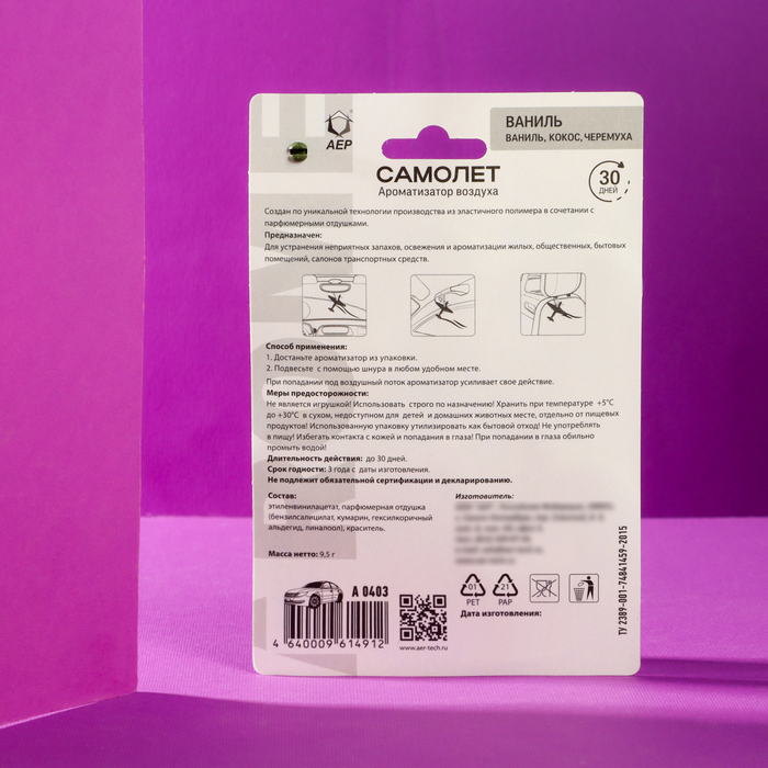 Ароматизатор подвесной Самолет ЯК-3, Ваниль — Характеристики