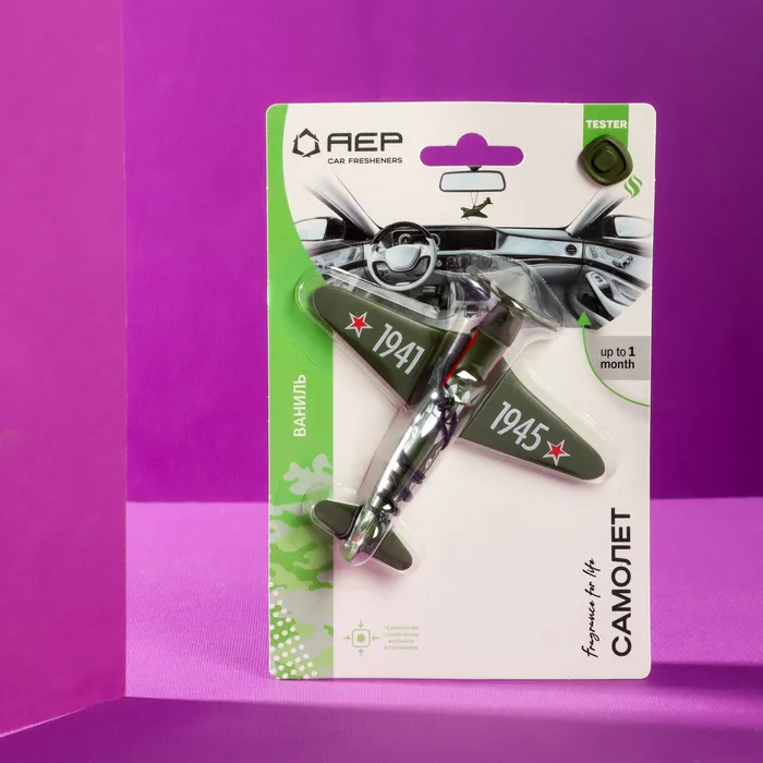 Ароматизатор с приятным ароматом ванили, выполнен в эксклюзивном дизайне в виде самолета як-3 оливкового цвета. Благодаря насыщенному аромату, неприятные запахи в салоне эффективно нейтрализуются. Ароматизатор оснащен подвесным типом крепления. Аромат держится до 30 дней.