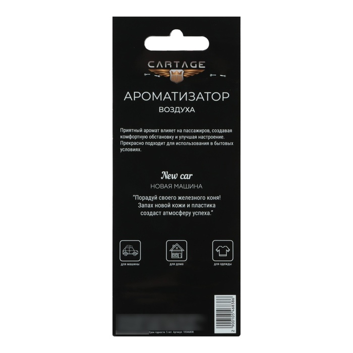 Картонный корпус ароматизатора подчеркивает его легкость и удобство в использовании. Просто повесьте его в удобном для вас месте, например, на зеркало заднего вида в автомобиле и наслаждайтесь непревзойденным ароматом новой машины