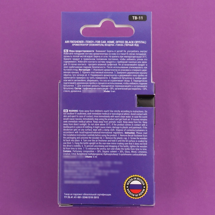 «Черный лед» - это бодрящий аромат мужского парфюма. Благодаря массивной деревянной крышке из натурального бука аромат плавнее и дольше передается в салоне, эффективно устраняя неприятные запахи. Для усиления аромата периодически переворачивайте флакон в закрытом состоянии и слегка пропитывайте крышку ароматической жидкостью. Для создания данной ароматической композиции используются только высококачественные парфюмерные отдушки из Франции.