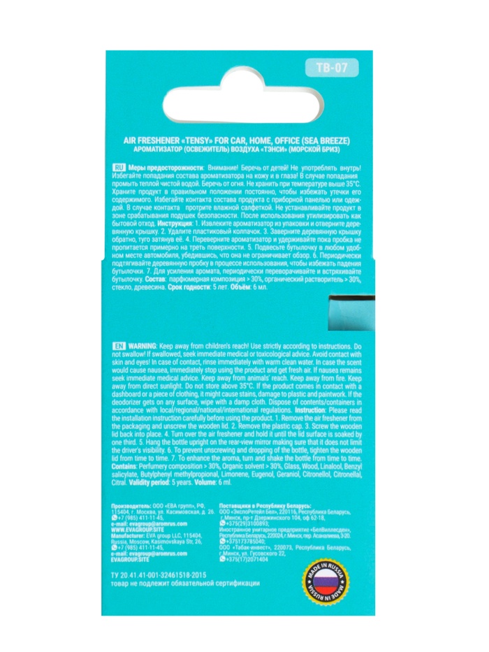 Подвесной ароматизатор TENSY в стеклянной бутылочке со стильным вощенным шнурком удобно использовать в автомобиле. Благодаря массивной деревянной крышке из натурального бука аромат плавнее и дольше передаётся в салоне, эффективно устраняя неприятные запахи. Для усиления аромата периодически переворачивайте флакон в закрытом состоянии и слегка пропитывайте крышку ароматической жидкостью. Для тех, кто хочет чувствовать рядом с собой спокойствие, уют и тихий ход времен. Кроме того, морской, океанический аромат создает ощущение чистоты и ухоженности.