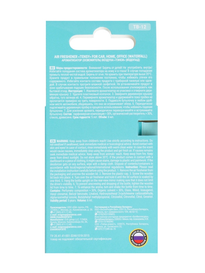Подвесной ароматизатор TENSY в стеклянной бутылочке со стильным вощенным шнурком удобно использовать в автомобиле. Благодаря массивной деревянной крышке из натурального бука аромат плавнее и дольше передаётся в салоне, эффективно устраняя неприятные запахи. Для усиления аромата периодически переворачивайте флакон в закрытом состоянии и слегка пропитывайте крышку ароматической жидкостью. Композиция аромата навевает мысли о прохладном водопаде, в который хочется окунуться жарким и знойным летом.