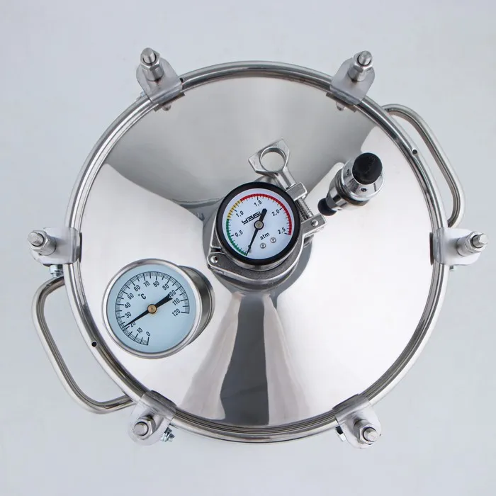 Включить плиту. Внимательно следить за температурой нагрева и по достижении температуры 102–112 °C отрегулировать нагрев плиты таким образом, чтобы клапан давления срабатывал периодически, при поддержании температуры в 102–115 °C и давлении 0,3–0,9 атм согласно показаниям манометра. Внимание! Возможны периодические выходы небольшого количества пара и капель воды из-под уплотнителя крышки.