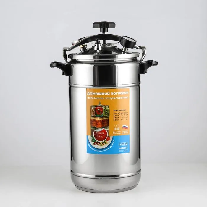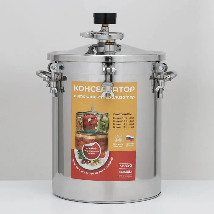 Автоклав предназначен для тепловой стерилизации пищевых продуктов в стеклянной или жестяной таре в домашних условиях. Особая технология крепления обеспечивает безопасную и точную работу: овальная крышка слегка фиксируется двумя вентилями снаружи, а далее — поддерживается давлением изнутри. Автоклав оснащён клапаном аварийного сброса давления, что позволяет избежать превышения допустимых показателей.