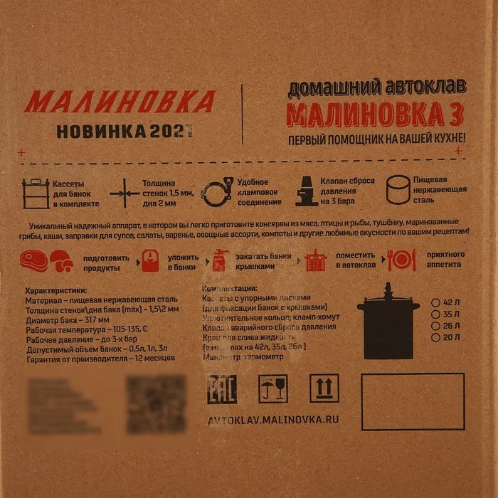 В автоклаве «Малиновка» можно приготовить тушёнку, каши, соусы, компоты, варенья, рыбные консервы, грибы и прочие вкусности. Получайте до 28 банок тушёнки всего за 40 минут! Радуйте себя и близких натуральными деликатесами, приготовленными своими руками.