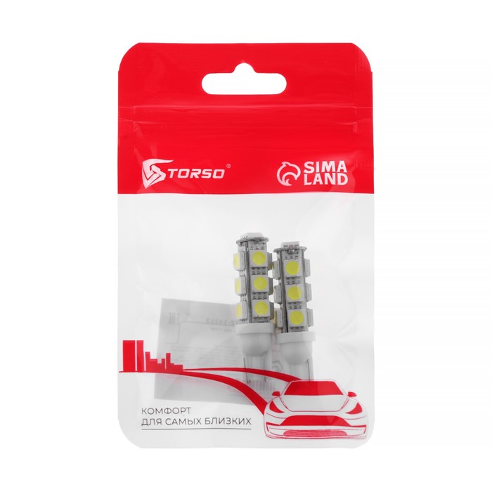 Автолампа T10 от TORSO - высококачественный продукт для автомобильной промышленности. Работает от 12 вольт, оснащена 13 светодиодами SMD 5050 для создания яркого и мощного света. Белый цвет обеспечивает более широкий обзор и четкую видимость. В наборе две лампы, можно заменить обе для равномерного света.