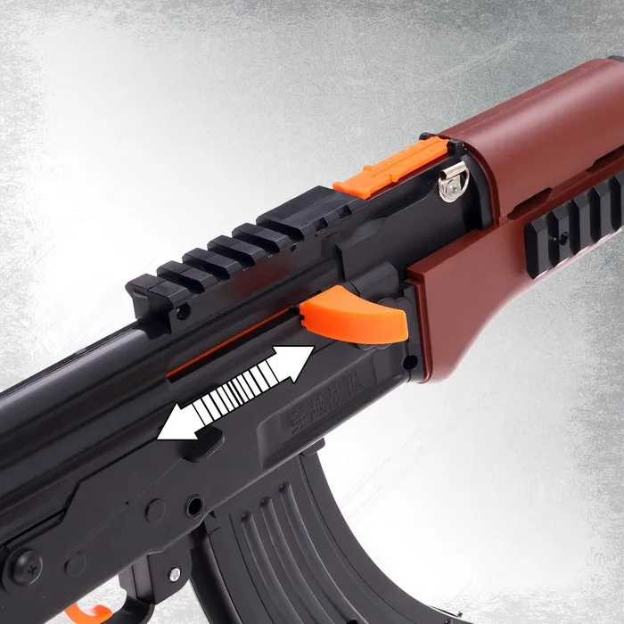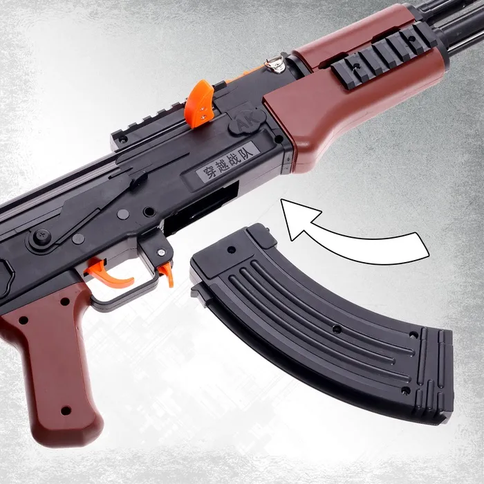 Созданный по мотивам легендарного АК-47, этот автомат подарит юному бойцу атмосферу настоящих спецопераций. Съёмный приклад и магазин делают игру более реалистичной, а мягкие пули с присосками безопасны для активных сражений.