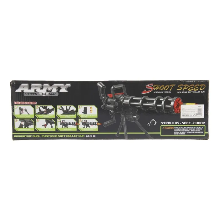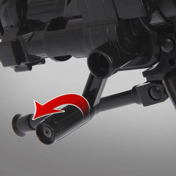 - Игрушка оснащена ручками для стрельбы и перемещения, благодаря сошке автомат надёжно стоит на месте и им легко управлять.