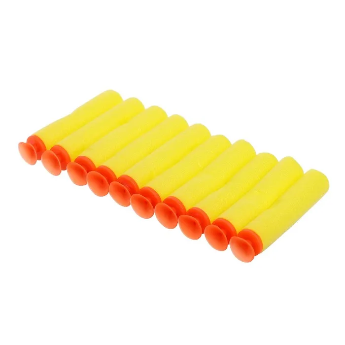 - Мягкие пули на присосках: 10 штук. Размеры 6 × 1,3 × 1,3 см.