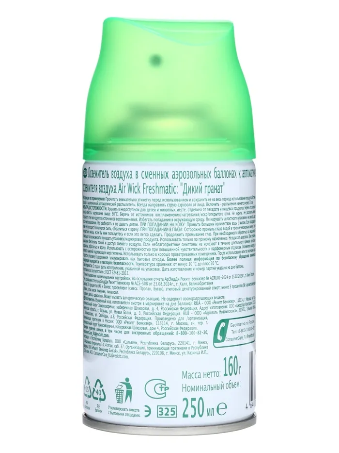 Сменный баллон освежителя воздуха поможет поддерживать в доме приятный и свежий аромат. Средство прекрасно борется с любыми нежелательными запахами. Его можно устанавливать на кухне, в ванной комнате или туалете. Аэрозоль не оставляет разводов и других следов на занавесках, мебели и других предметах.