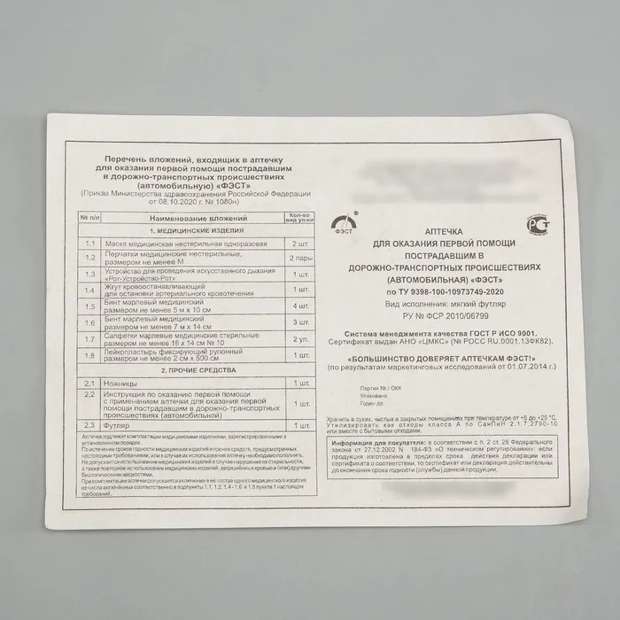 Автомобильная аптечка соответствует требованиям Минздрава РФ и изготовлена по стандартам ГОСТ. Её наличие в машине гарантирует уверенность в экстренных ситуациях, что делает её полезным приобретением для водителей, в том числе начинающих. Она станет отличным подарком для автомобилистов и пригодится при прохождении техосмотра.