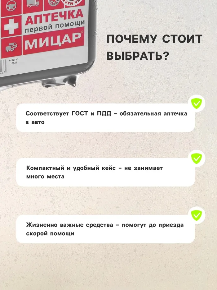 Автомобильная аптечка первой помощи №1 «Мицар» в дорожном футляре 5М — это надежное и необходимое средство обеспечения безопасности в пути. Она поможет своевременно оказать первую помощь в экстренных ситуациях, обеспечивая защиту и спокойствие водителя и пассажиров.