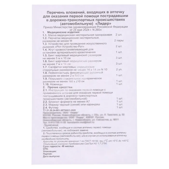 Автомобильная аптечка первой помощи TORSO,дорожная, новый состав, ГОСТ 2024, по приказу 260н — Характеристики
