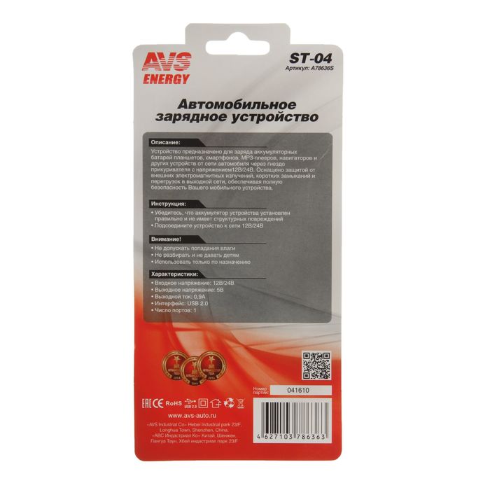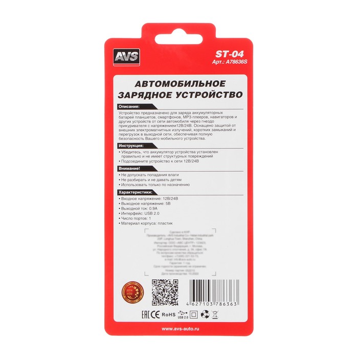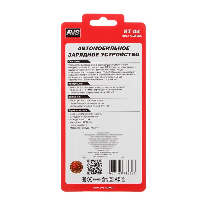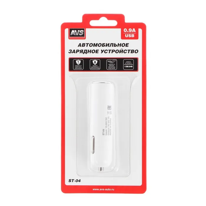 Автомобильное зарядное устройство AVS ST-04, 12/24 В, 0,9 А — Характеристики