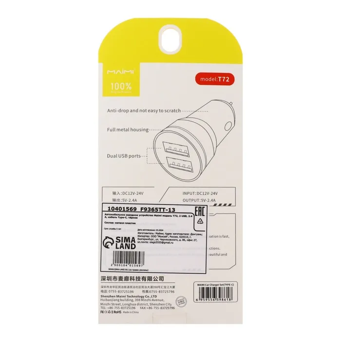 Автомобильное зарядное устройство Maimi T72 — это компактный и мощный аксессуар, обеспечивающий быструю зарядку ваших устройств в пути. С двумя USB-портами и максимальным выходным током 2,4 А, оно позволяет одновременно заряжать два устройства, что особенно удобно для длительных поездок.