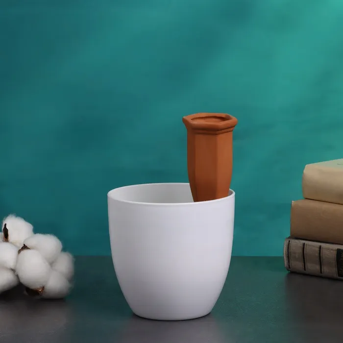 Принцип действия автополива: воздух, который находится выше уровня жидкости в колбе, расширяется в зависимости от изменения температуры окружающей среды, и выдавливает влагу в почву, поливая растение.