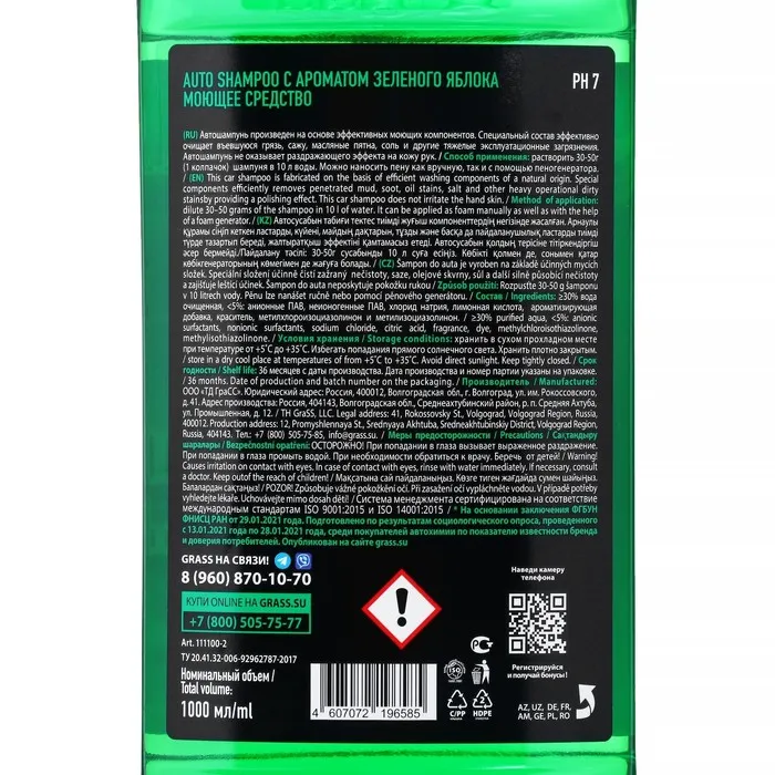 Автошампунь Grass Universal, яблоко, 1 л, контактный — Характеристики