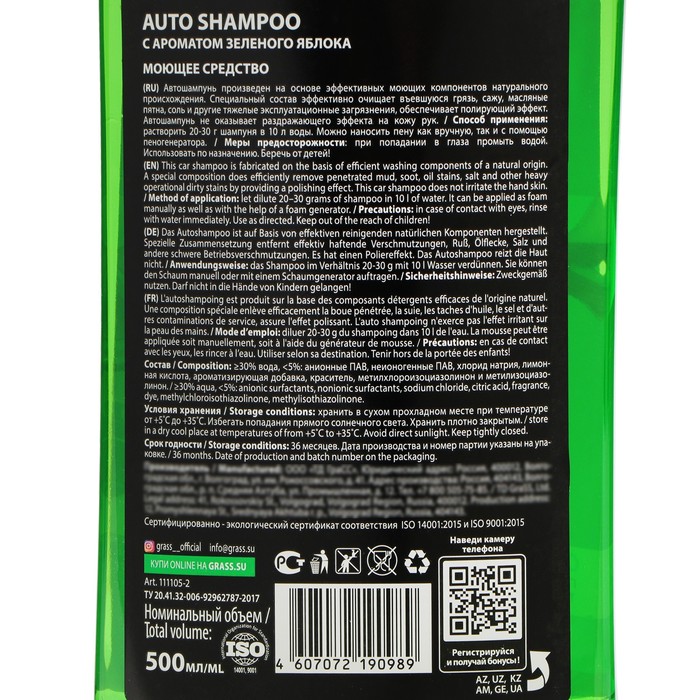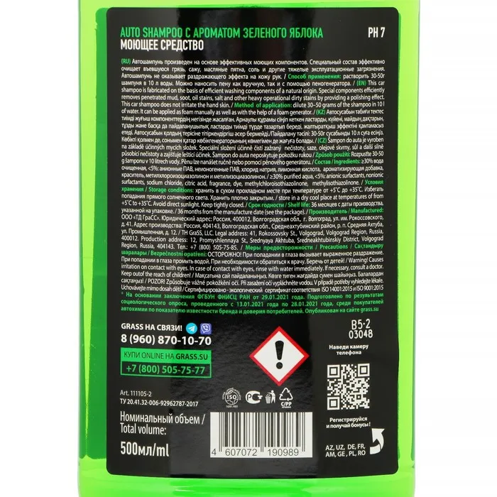 Автошампунь произведен на основе эффективных моющих компонентов. Специальный состав эффективно очищает въевшуюся грязь, сажу, масляные пятна, соль и другие тяжелые эксплуатационные загрязнения, обеспечивает полирующий эффект. Автошампунь не оказывает раздражающего эффекта на кожу рук.