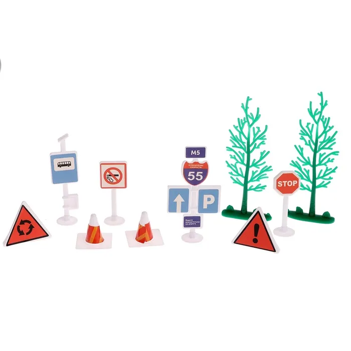 - В набор входят элементы окружения: дорожные знаки, деревья и заправочная станция.