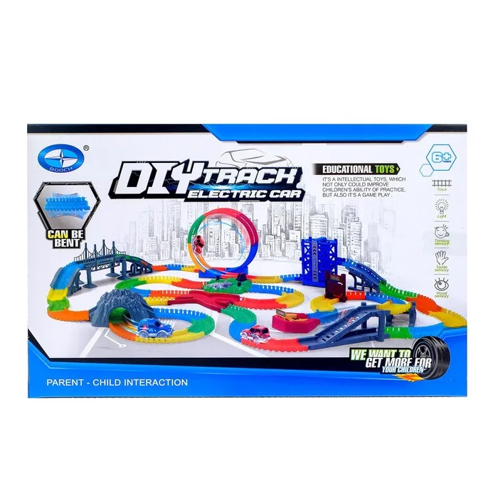 «Магический трек» — это набор для зрелищных заездов. Ребёнка удивит то, что дорогу можно собрать не просто так, чтобы она поворачивала и петляла в разные стороны, но также сделать выпуклой или вогнутой или вообще закольцевать, заставив машинку ехать внутри неё.