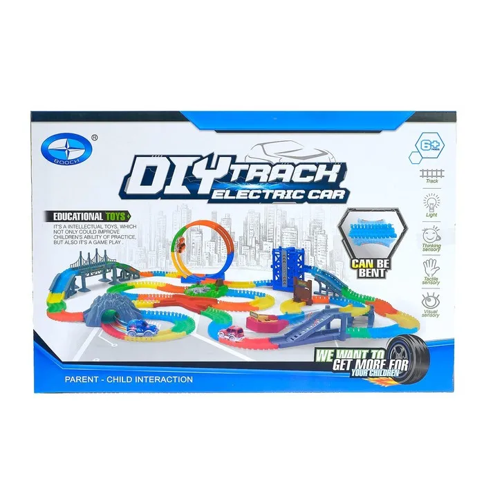 «Магический трек» — это набор для зрелищных заездов. Ребёнка удивит то, что дорогу можно собрать не просто так, чтобы она поворачивала и петляла в разные стороны, но также сделать выпуклой или вогнутой или вообще закольцевать, заставив машинку ехать внутри неё.