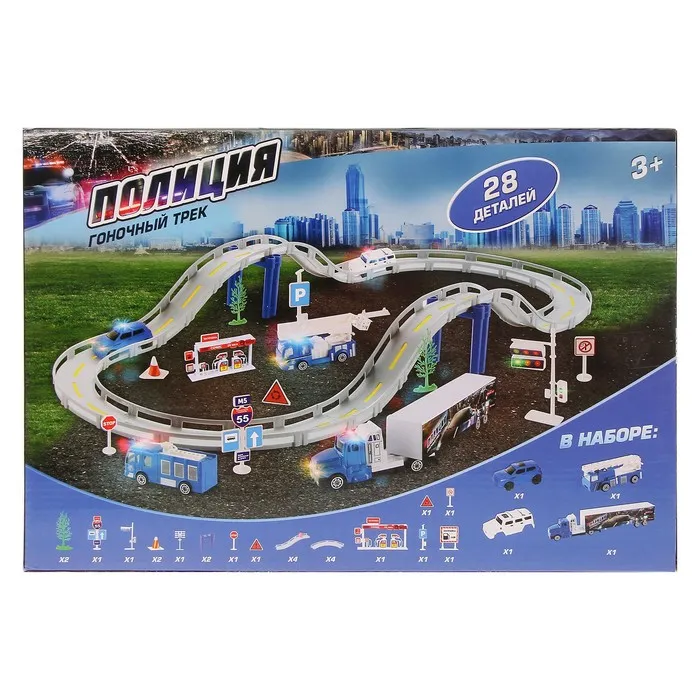С детским автотреком «Полиция» ребёнок устроит захватывающие гонки на длинной трассе, организует преследование преступника и спасёт город от опасности.