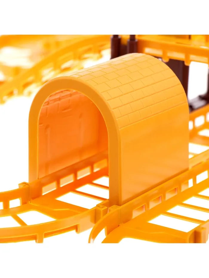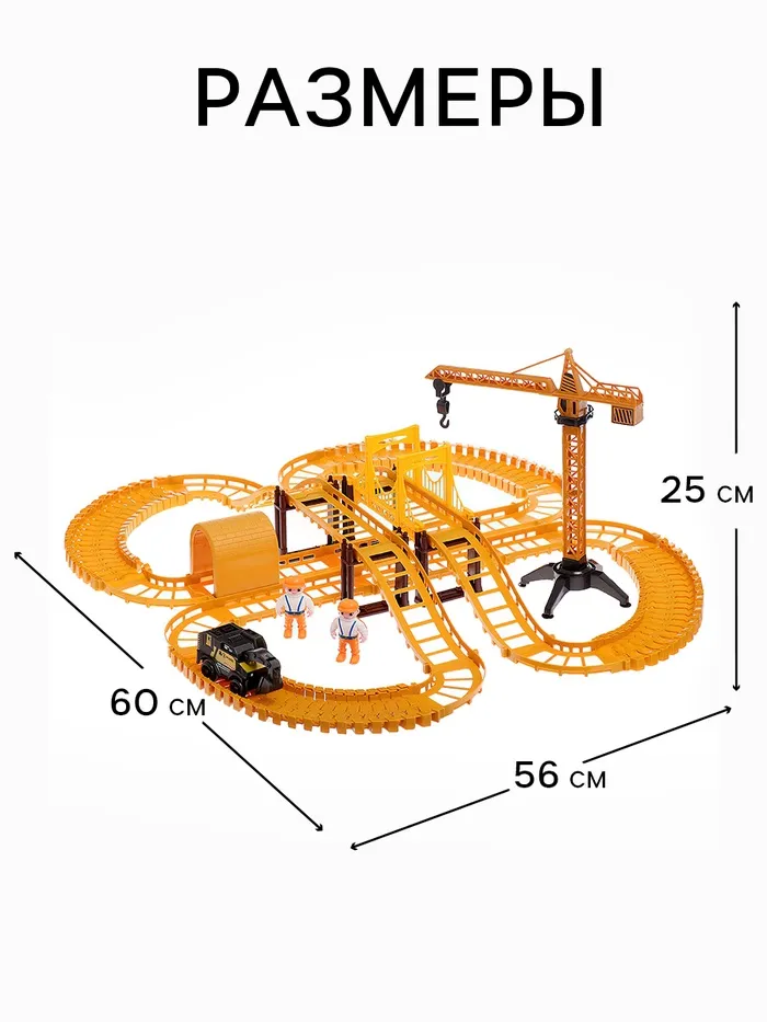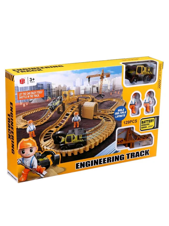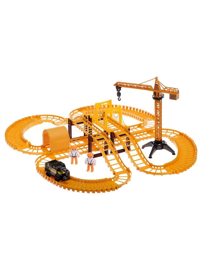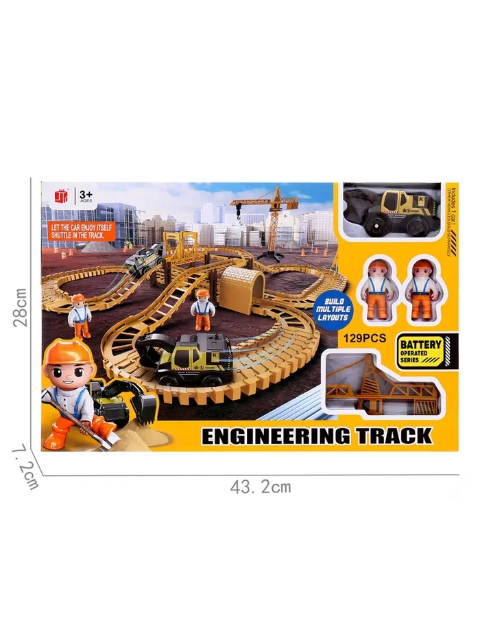 - 129 деталей в комплекте, включая рельсы, мосты, туннели, строительную технику, мини-фигурки рабочих (2 шт.) и дополнительные аксессуары для создания масштабной строительной площадки.