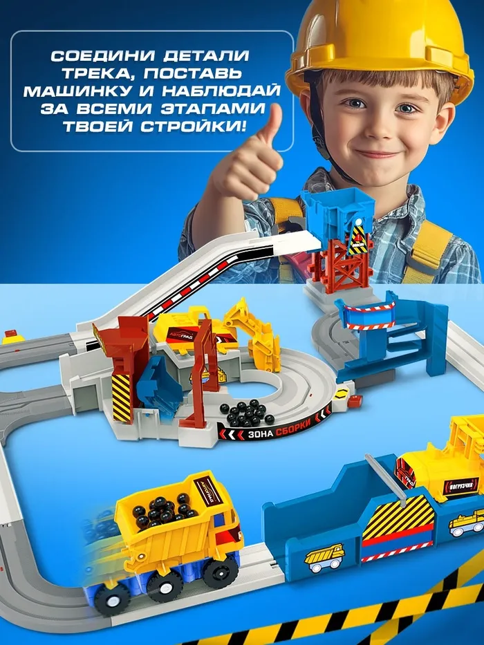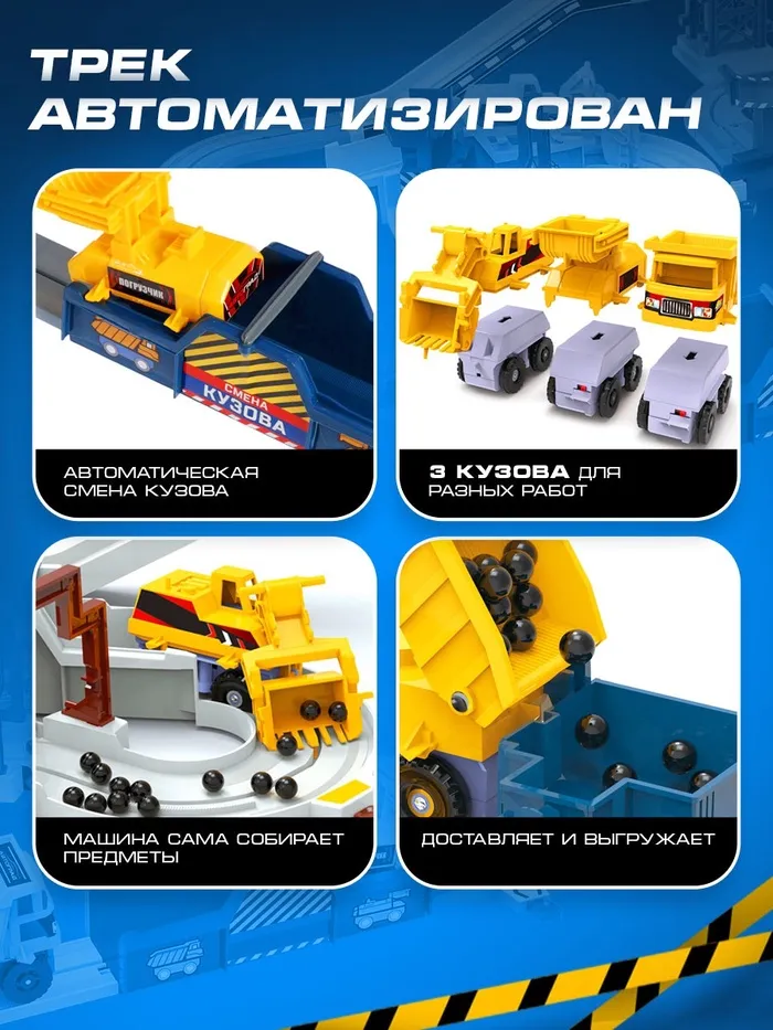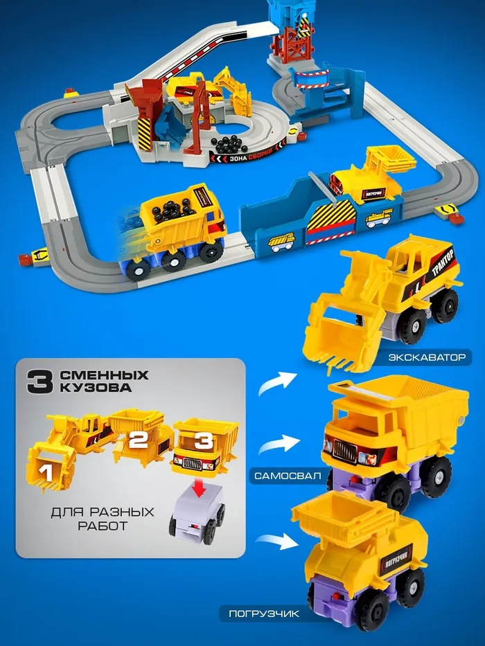 Стройка, которая оживает! Интерактивный строительный автотрек с машинкой — это умная игрушка для маленьких мастеров. Одна машинка умеет превращаться в три спецтехники: трактор, самосвал и погрузчик. Работает от одной батарейки AA — игра начинается одним нажатием.